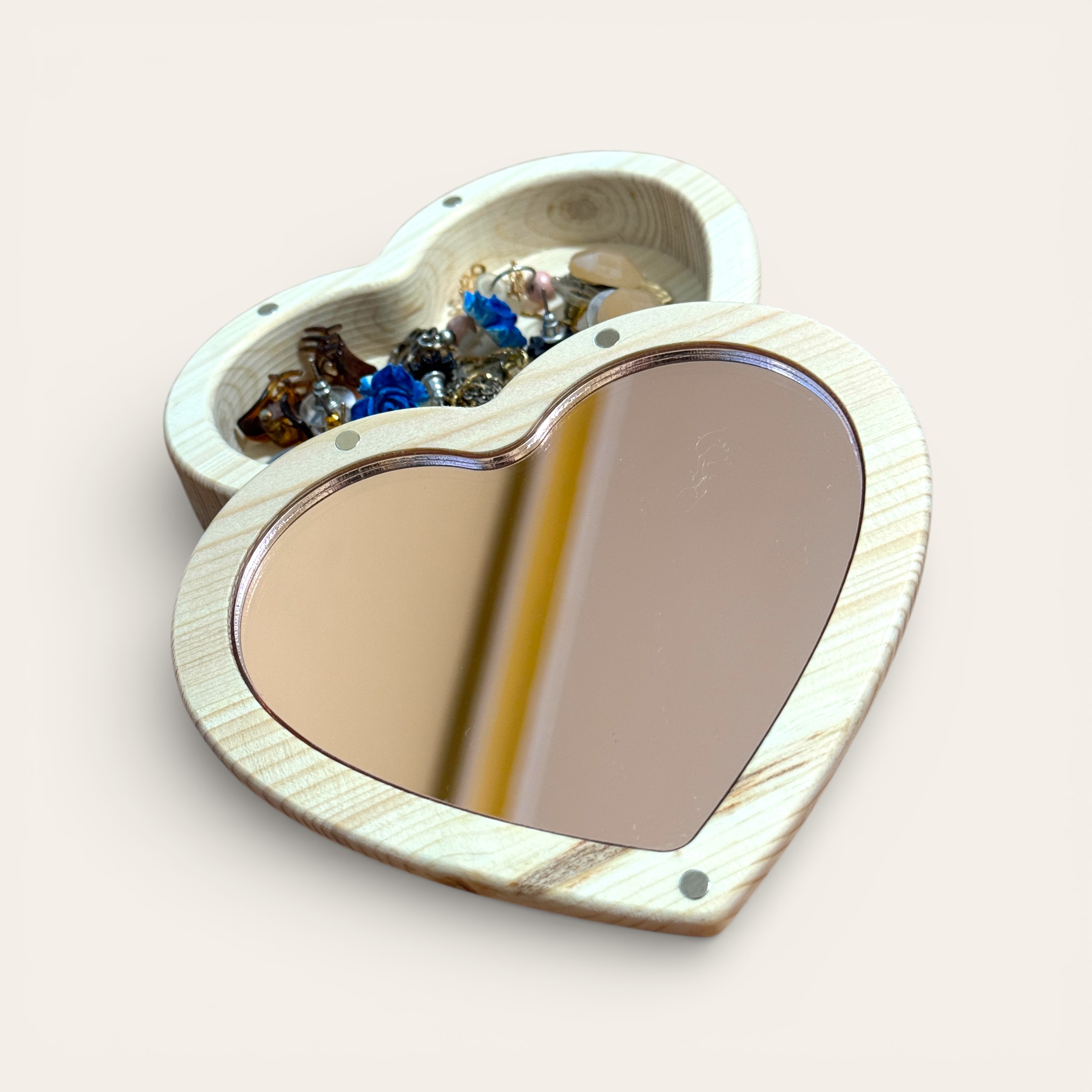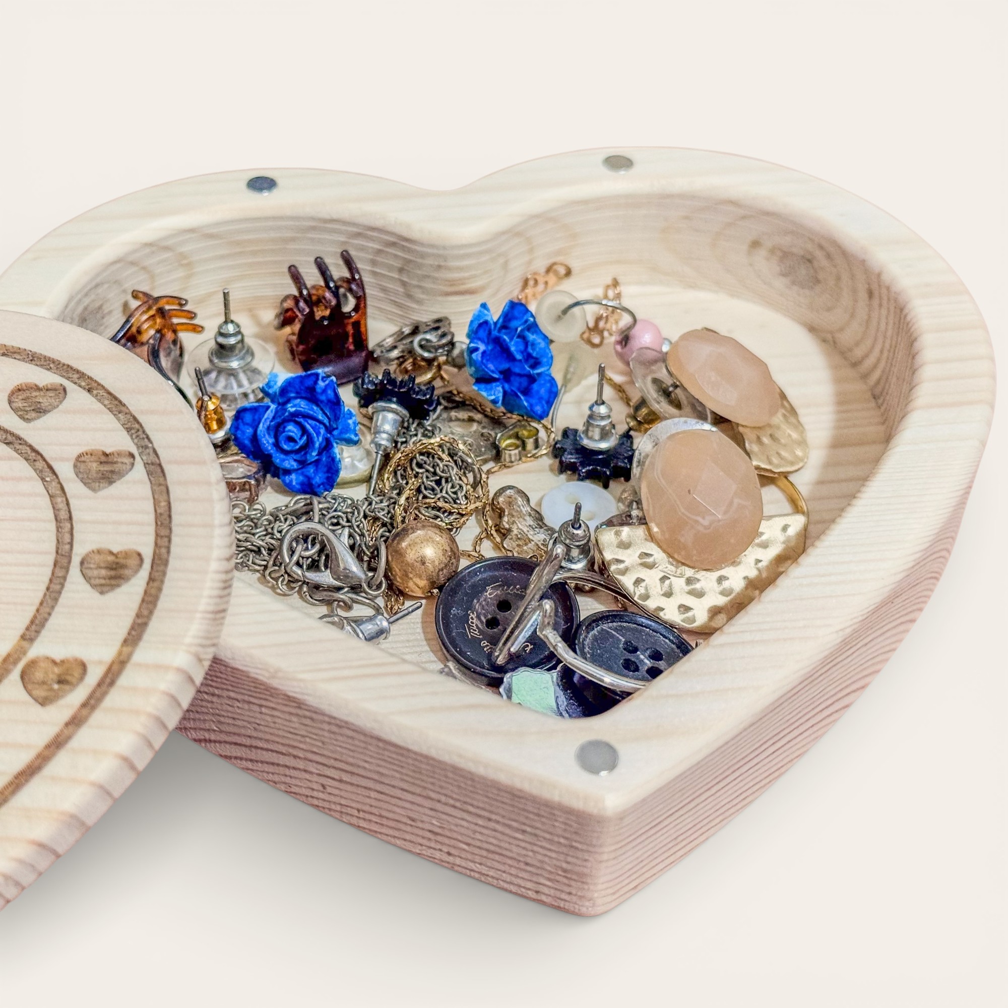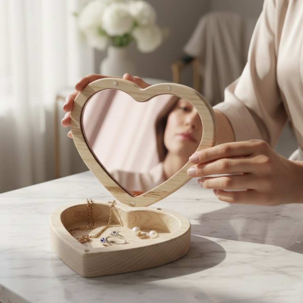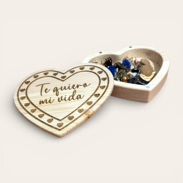 Descubra o aconchego e a elegância da madeira natural com este exclusivo porta-joias em formato de coração, feito à mão em madeira de pinho maciça e projetado para preservar suas joias e memórias mais especiais.